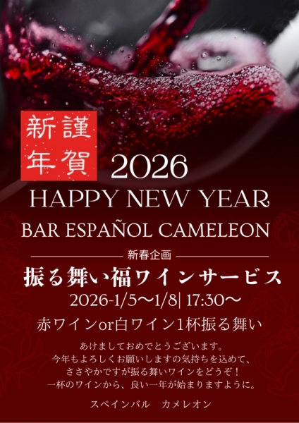 1月5日(月)から1月8日(木)までの期間、ご来店のお客様へ赤ワインまたは白ワインを1杯、振る舞い酒と...