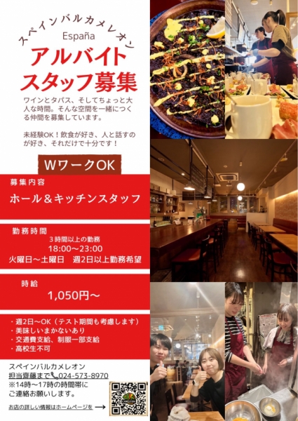 【福島大学生歓迎】福島市のおしゃれスペインバル|アルバイトスタッフ募集(まかない付き・週2〜OK)